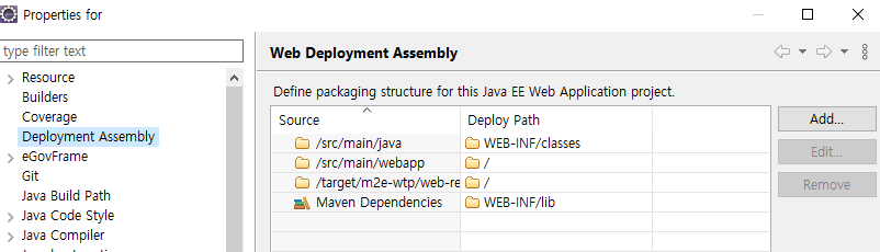 2. 아마도 Maven Dependencies가 없을 확률이 큰데, Deployment Assembly 클릭 후 Add 버튼을 클릭한다.